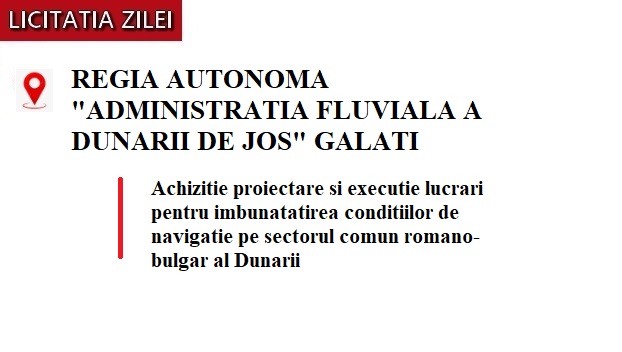 Galați, 23 oct. 2025 – Regia Autonomă „Administrația Fluvială a Dunării de Jos” Galați a lansat o procedură de licitație deschisă pentru atribuirea unui contract de proiectare și execuție lucrări destinate îmbunătățirii condițiilor de navigație pe sectorul comun româno-bulgar al Dunării. Proiectul este derulat în cadrul programului FAST Danube 2, care vizează modernizarea infrastructurii fluviale și creșterea siguranței transportului naval.