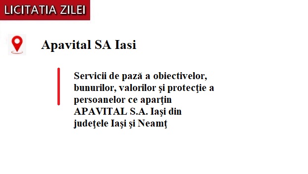 Iasi 10 Nov 2025 - Apavital S.A. Iași, operator regional de apă și canalizare, a lansat în data de 10 noiembrie 2025, o licitație deschisă pentru atribuirea unui contract de servicii de pază. Procedura vizează protecția obiectivelor, bunurilor, valorilor și persoanelor din județele Iași și Neamț, cu desfășurare exclusiv online și atribuire sub forma unui contract de achiziții publice.