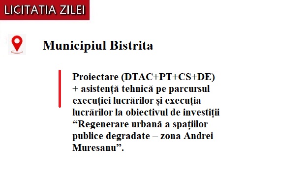 Bistrita 30 oct 2025 - Municipiul Bistrița a lansat o procedură de achiziție publică pentru proiectarea, asistența tehnică și execuția lucrărilor aferente obiectivului de investiții „Regenerare urbană a spațiilor publice degradate – zona Andrei Mureșanu”. Proiectul are ca scop principal îmbunătățirea calității vieții și creșterea nivelului de trai în cartierele construite în perioada 1960–1989, prin modernizarea spațiilor publice și adaptarea lor la nevoile actuale ale comunității.