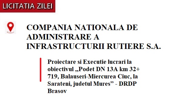 Brasov 18 Nov 2025 - Compania Națională de Administrare a Infrastructurii Rutiere (CNAIR) prin DRDP Brasov a lansat procedura de licitație deschisă pentru proiectarea și execuția lucrărilor la obiectivul „Podeț DN 13A km 32+719, Bălăușeri–Miercurea Ciuc, la Sărățeni, județul Mureș”.