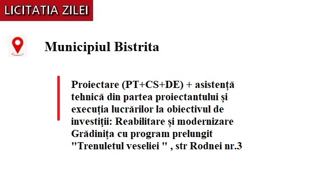 Bistrița, 21 octombrie 2025 – Municipiul Bistrița a lansat o procedură de achiziție publică pentru proiectarea, asistența tehnică și execuția lucrărilor de reabilitare și modernizare a Grădiniței cu program prelungit „Trenulețul veseliei”, situată pe strada Rodnei nr. 3. Investiția vizează atât partea de documentație tehnică (PT+CS+DE), cât și implementarea efectivă a lucrărilor, cu sprijinul proiectantului pe parcursul derulării proiectului.