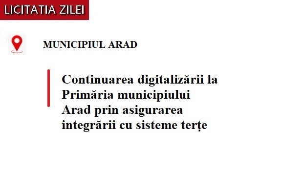 Arad, 14.10.2025 - Primăria Municipiului Arad face un nou pas în procesul de digitalizare, lansând o licitație publică pentru servicii de integrare cu sisteme terțe, cu o valoare estimată de 136.702,48 lei. Proiectul urmărește extinderea și eficientizarea platformelor informatice existente, astfel încât acestea să poată comunica mai ușor cu alte sisteme utilizate la nivel național și local.
