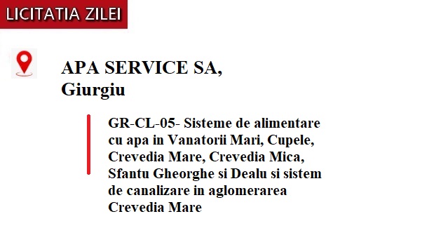 Giurgiu 5 Nov 2025 - APA SERVICE SA a lansat o procedură de licitație deschisă pentru un proiect de infrastructură de amploare în județul Giurgiu. Investiția, estimată la peste 74 de milioane de lei, vizează realizarea unor sisteme de alimentare cu apă în localitățile Vânătorii Mari, Cupele, Crevedia Mare, Crevedia Mică, Sfântu Gheorghe și Dealu, precum și implementarea unui sistem de canalizare în aglomerarea Crevedia Mare.