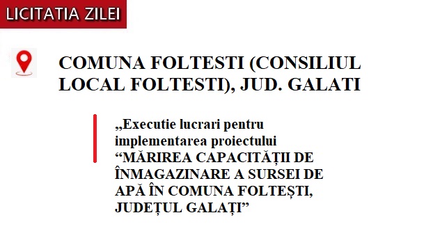 Foltești, Galati - 12.01.2026, Comuna Foltești, din județul Galați, a lansat o procedură simplificată pentru execuția lucrărilor aferente proiectului „Mărirea capacității de înmagazinare a sursei de apă”. Contractul vizează intervenții tehnice necesare pentru îmbunătățirea infrastructurii locale de alimentare cu apă, în contextul creșterii cerințelor de consum și al necesității de modernizare a rețelelor existente.
