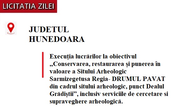 Hunedoara, 19 Ian 2026 - Județul Hunedoara a lansat o procedură simplificată pentru execuția lucrărilor de conservare, restaurare și punere în valoare a Drumului Pavat din cadrul sitului arheologic Sarmizegetusa Regia, în zona Dealul Grădiștii. Intervenția vizează atât lucrările propriu-zise, cât și serviciile de cercetare și supraveghere arheologică necesare pe durata execuției.