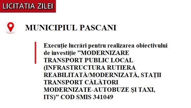 Iasi, 14 Ian 2026 - Municipiul Pașcani a deschis procedura de achiziție pentru execuția lucrărilor aferente proiectului „Modernizare transport public local (infrastructura rutieră reabilitată/modernizată, stații transport călători modernizate – autobuze și taxi, ITS)”, cod SMIS 341049. Procedura este organizată sub forma unei licitații deschise și se desfășoară exclusiv online, în conformitate cu legislația privind achizițiile publice.