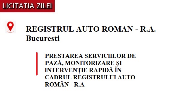 București, 16 oct. 2025 – Registrul Auto Român – R.A. (RAR) a inițiat o licitație deschisă pentru atribuirea unui contract de servicii de pază, monitorizare și intervenție rapidă. Procedura se desfășoară online, iar atribuirea se va face sub forma unui acord-cadru.