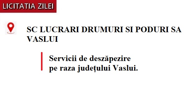 Vaslui, 11 Nov 2025 - Autoritatea contractantă SC Lucrări Drumuri și Poduri SA Vaslui a inițiat o procedură de licitație deschisă, desfășurată în format ONLINE, pentru atribuirea unui acord-cadru privind serviciile de deszăpezire pe raza județului Vaslui. Documentația prevede intervenții pe drumurile județene în sezonul rece, cu scopul de a asigura siguranța circulației și continuitatea transportului local și regional.